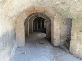 Unlike most other ancient sites, Pompeii was not re-built many times over the centuries, so we can walk down the streets today and see the town as it was laid out in the first century. Even the marble covering for the brickwork remains, since no rock-robbers were able to take it, buried deep beneath the ash.